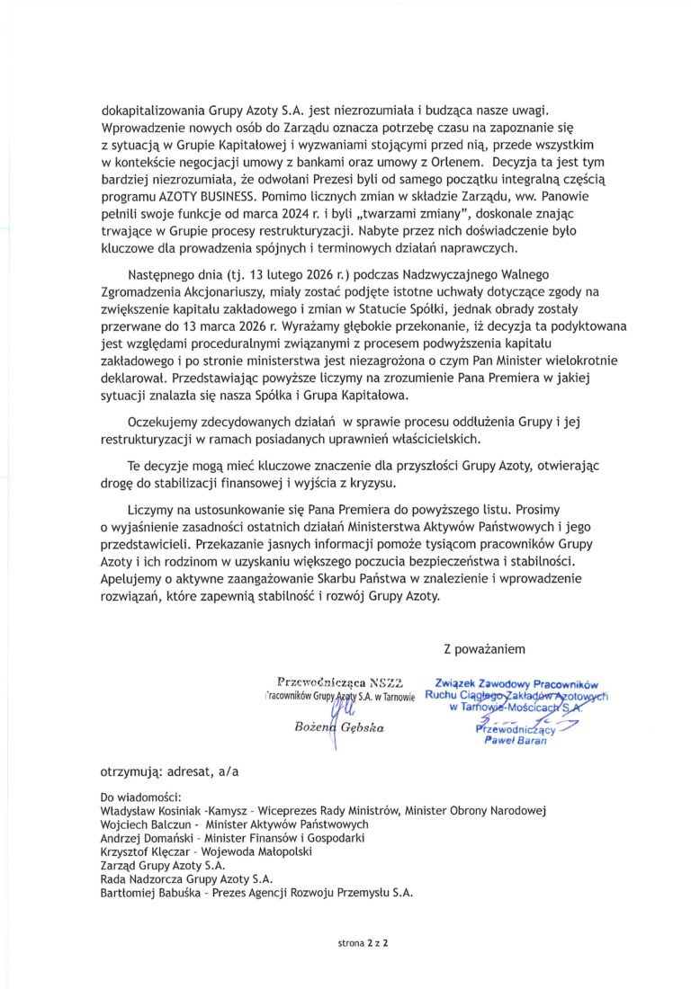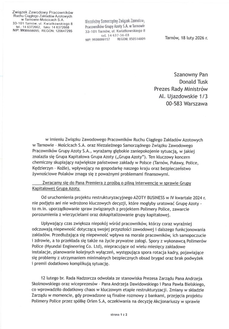 List do Prezesa Rady Ministrów w sprawie sytuacji w Grupie Azoty