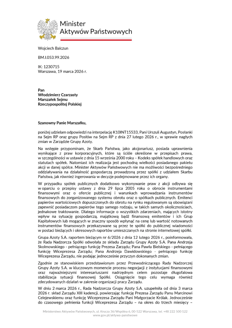 Mamy to czarno na białym – Ministerstwo Aktywów Państwowych po prostu kpi z ludzi. Przeczytaliśmy tę odpowiedź na interpelację posłów i ręce opadają. To marny popis urzędniczej spychologii: na rzeczowe pytania o powody rozbicia zarządu w samym szczycie negocjacji z bankami, Minister Balczun serwuje nam jedynie wykład z Kodeksu spółek handlowych.