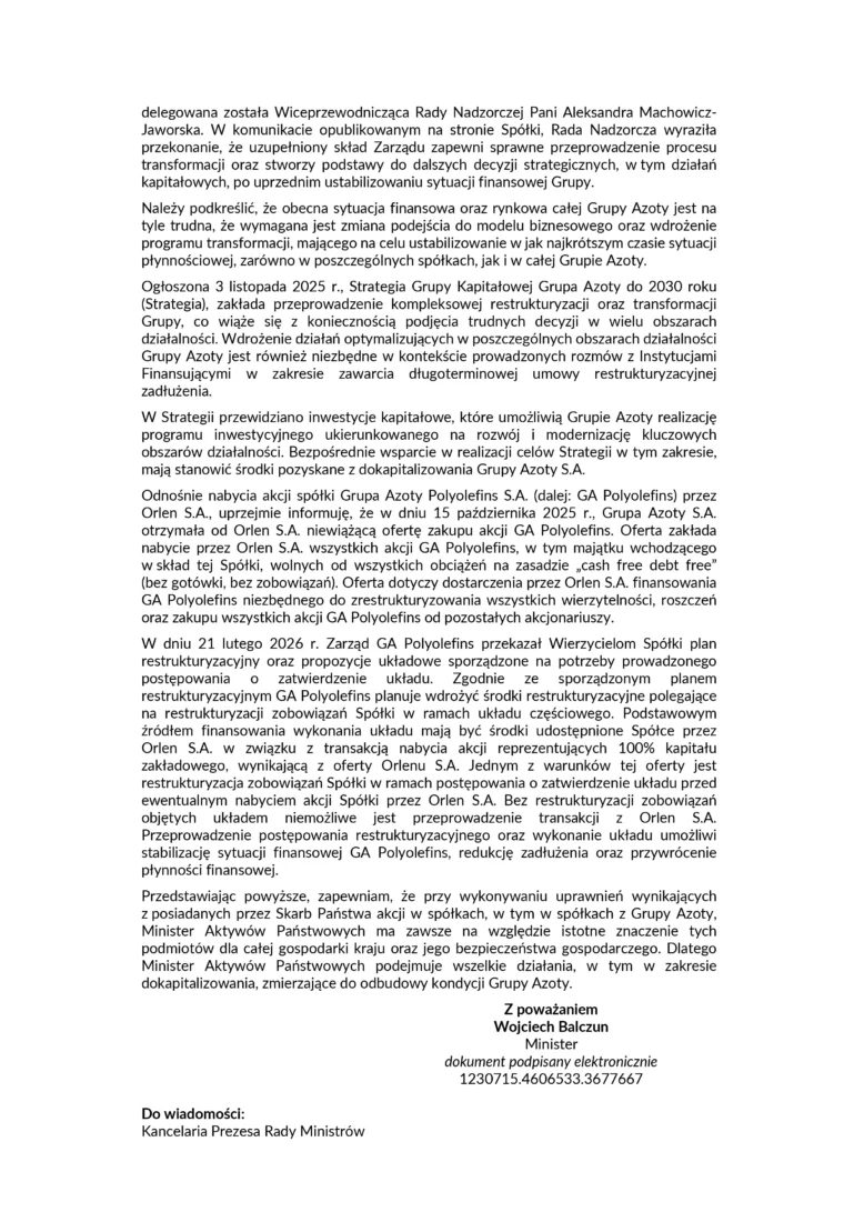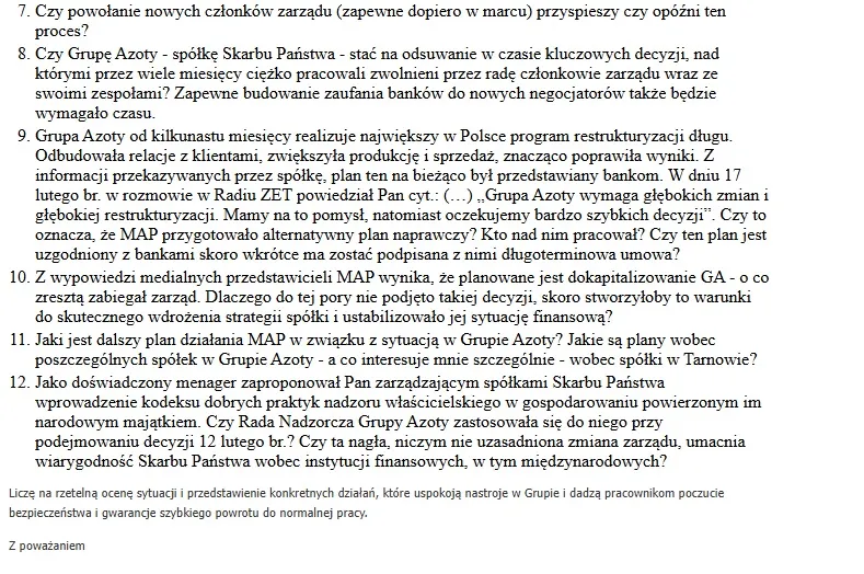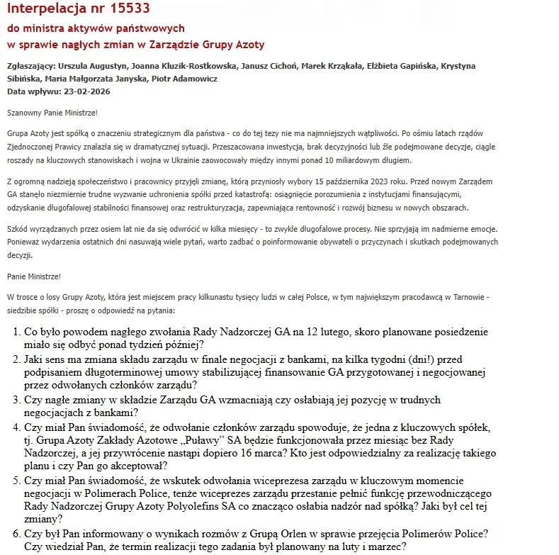 Jeśli na fundamentalne pytania o losy tysięcy pracowników i ich rodzin oraz bezpieczeństwo instalacji minister odpowiada streszczeniem ogólnodostępnych komunikatów, to znaczy, że w Warszawie nikt nie ma pojęcia, jak wyciągnąć Grupę Azoty z dołka. Ta odpowiedź to ostateczny dowód, że resort całkowicie abdykował z roli nadzorcy i po prostu nie panuje nad sytuacją.